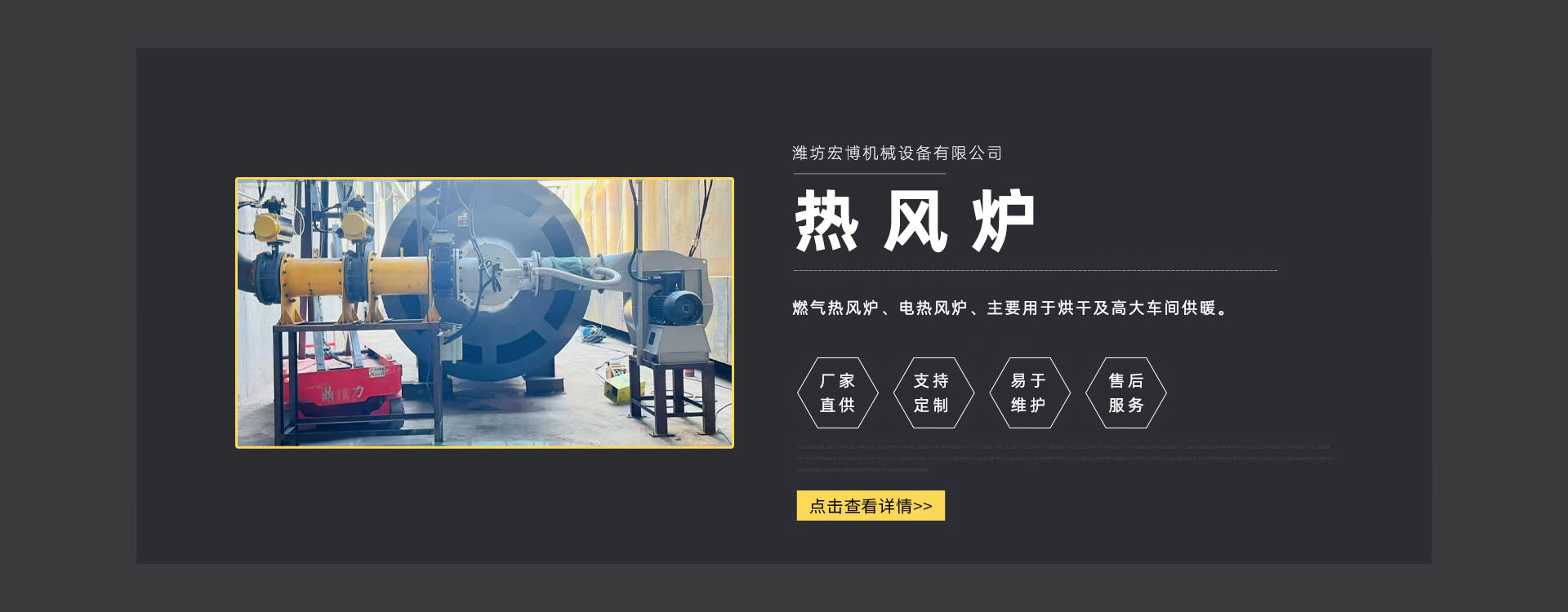 濰坊宏博機械設(shè)備有限公司是從事熱風爐、烘干設(shè)備、供暖設(shè)備的研發(fā)、設(shè)計、制造和服務于一體的實體企業(yè)。長期以來,企業(yè)以市場的發(fā)展和客戶的需求為導向,集多年的生產(chǎn)技術(shù)與經(jīng)驗為一體,不斷開發(fā)和優(yōu)良產(chǎn)品。